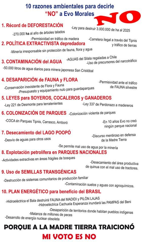ninguna especie animal o vegetal, ningún río o lago sea eliminado o exterminado por acción de los seres humanos” (Evo Morales - Decálogo 2008)